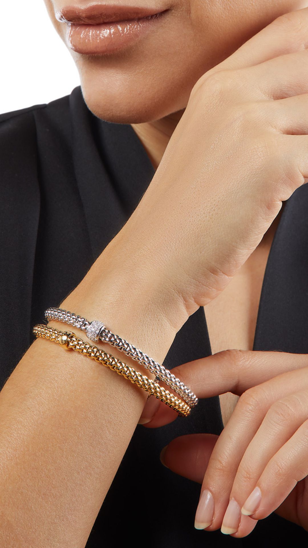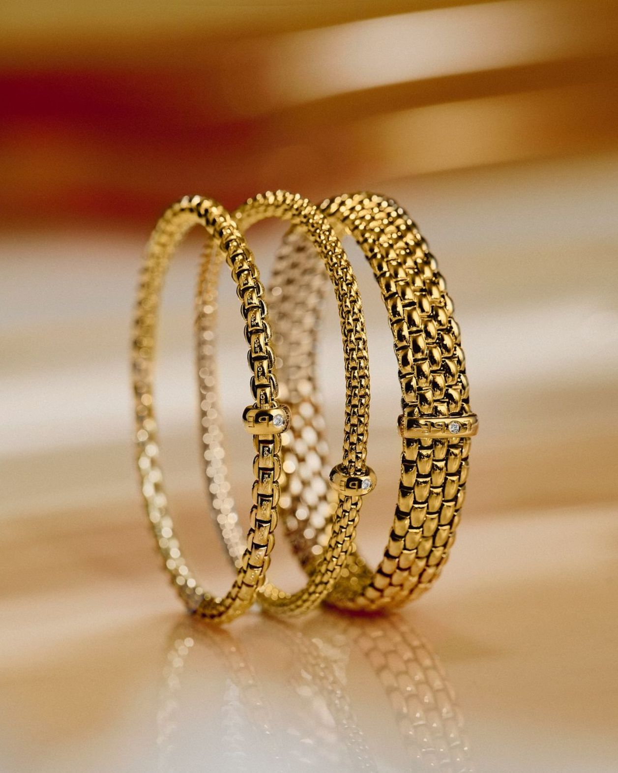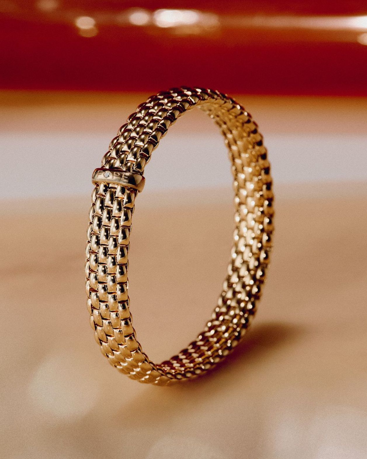 FOPE vervaardigt gouden sieraden, al dan niet versierd met diamanten van uitstekende kwaliteit en een bijzondere schoonheid. De gewoven schakels van 18 karaat goud zijn rekbaar waardoor de juwelen zeer comfortabel dragen. Er komt geen sluiting aan te pas, u schuift deze juwelen zo om de pols. In elke kleur goud zijn de armbanden even mooi!