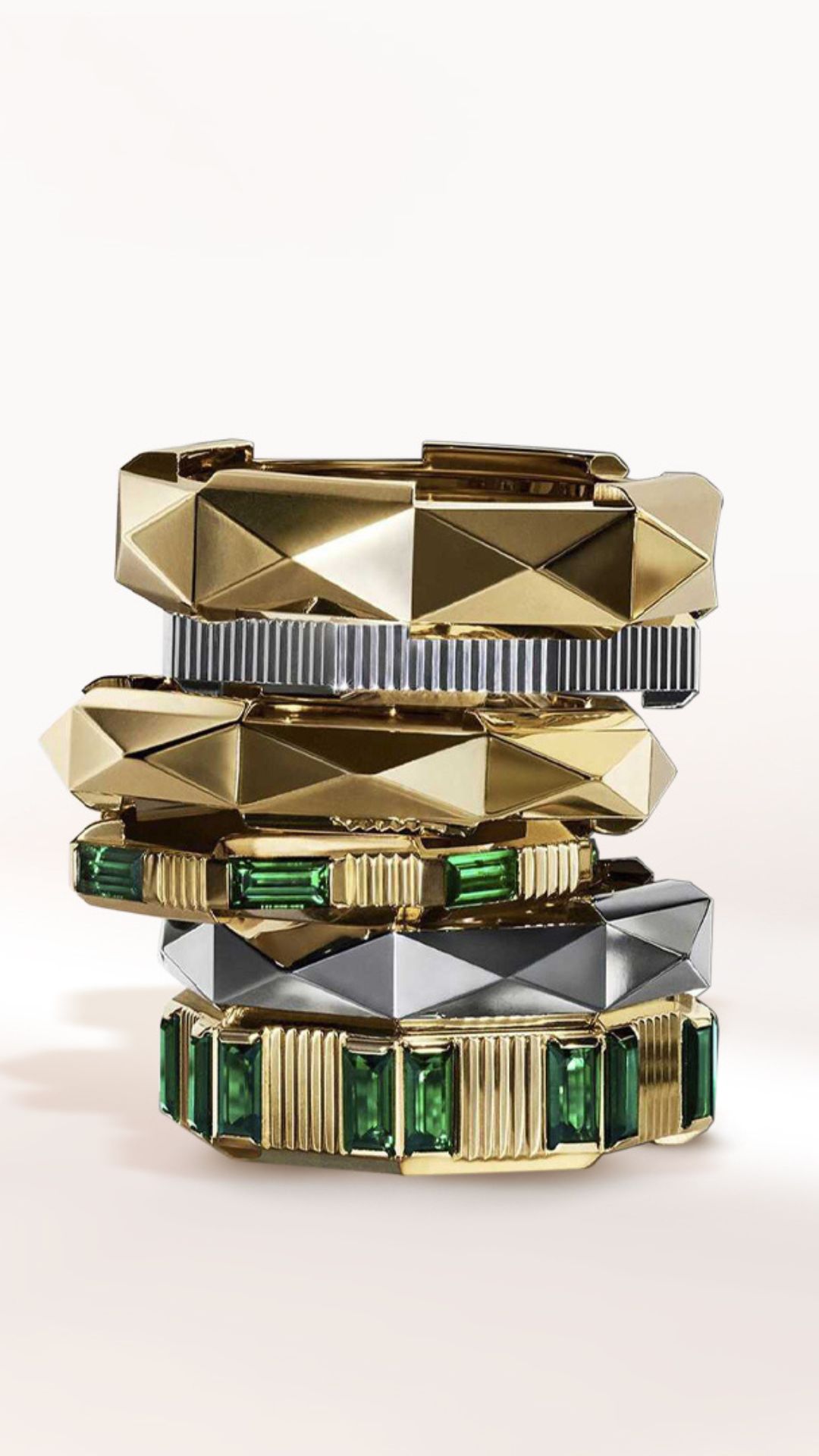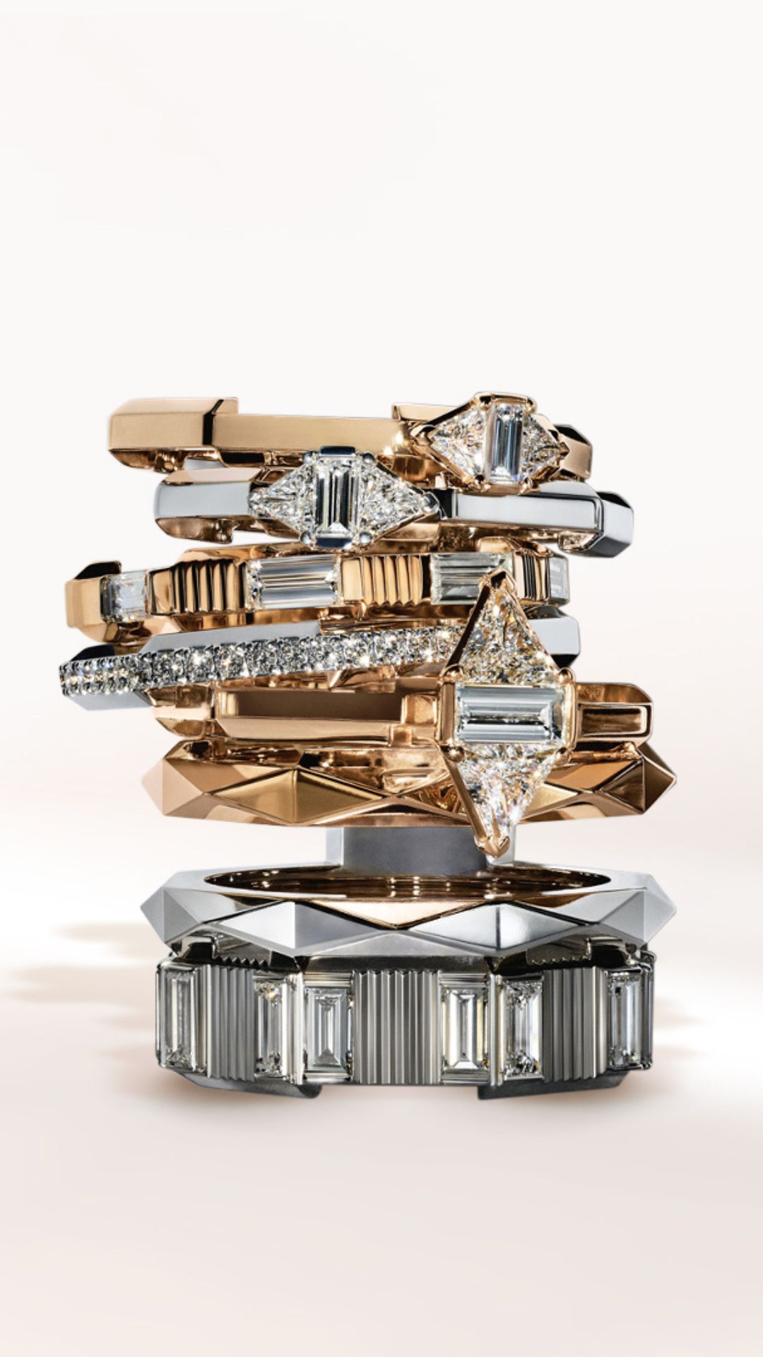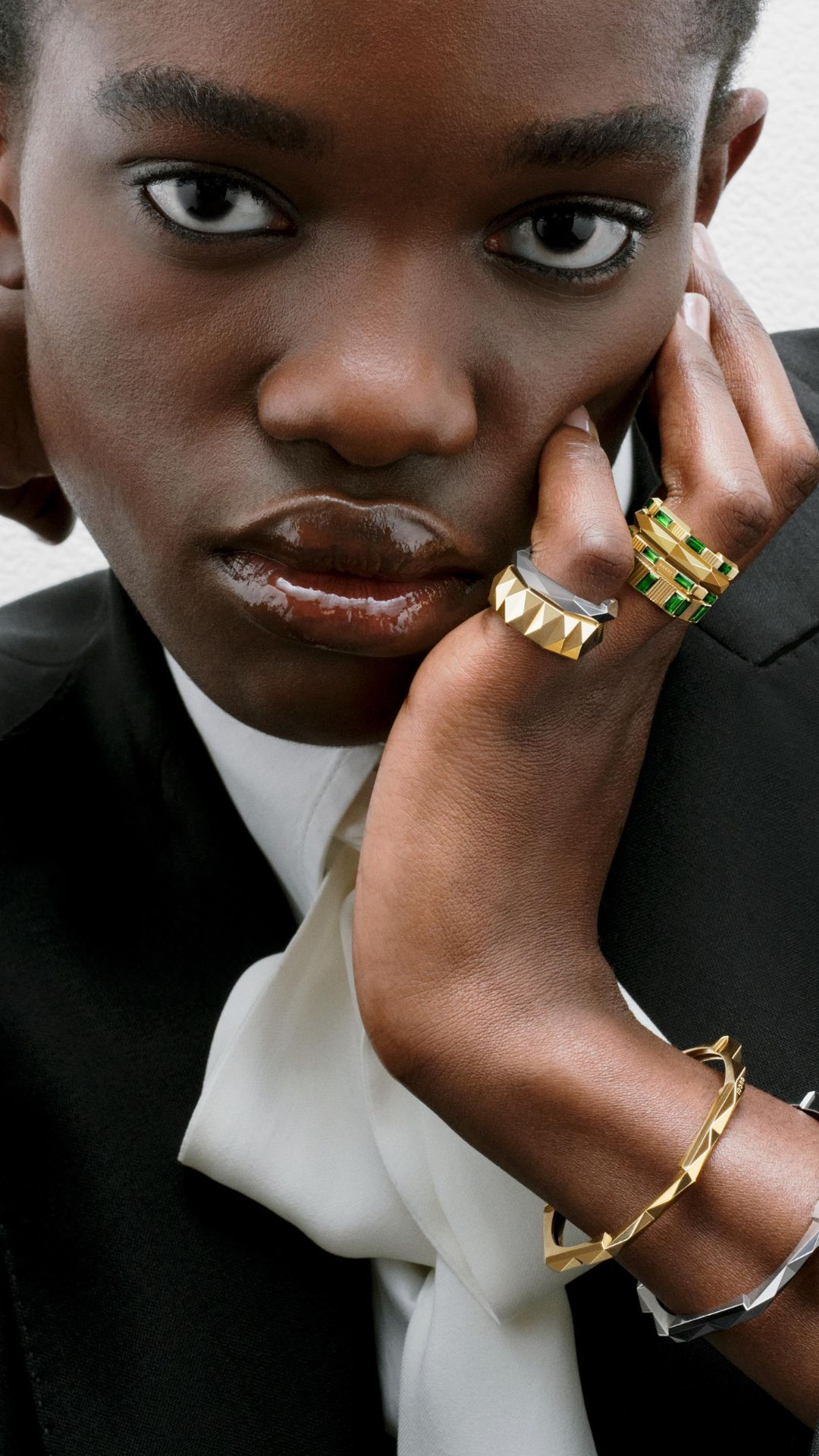 Kettingen, armbanden en ringen in verschillende breedtes zijn gemaakt van 18kt wit-, rosé- of geelgoud met studs of nieuwe schakels, in een effen afwerking of bezet met diamanten. De ringen kunnen alleen of gestapeld worden gedragen en bieden talloze stylingopties, weerspiegeld in hun achthoekige vormen die oneindigheid symboliseren.