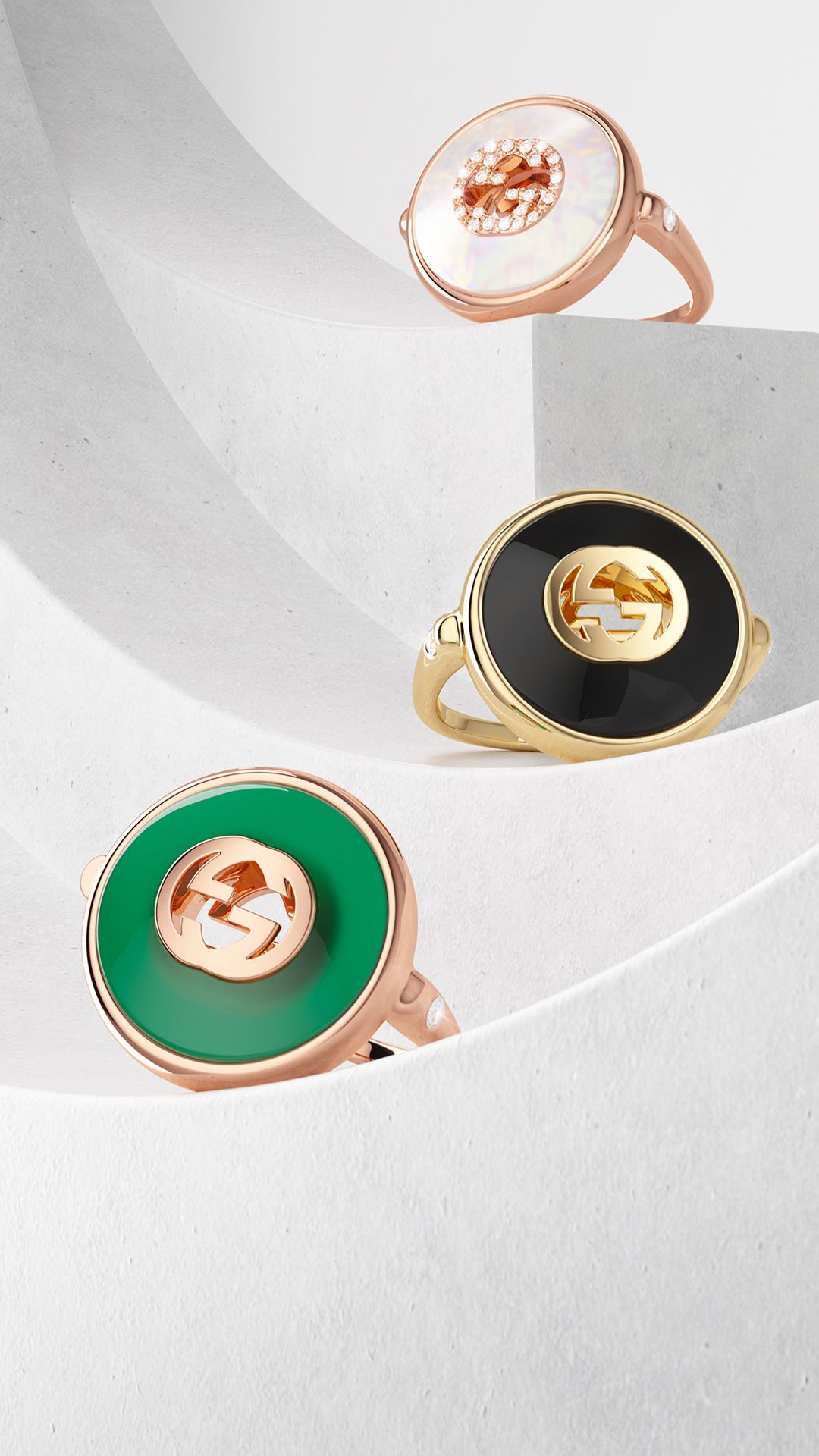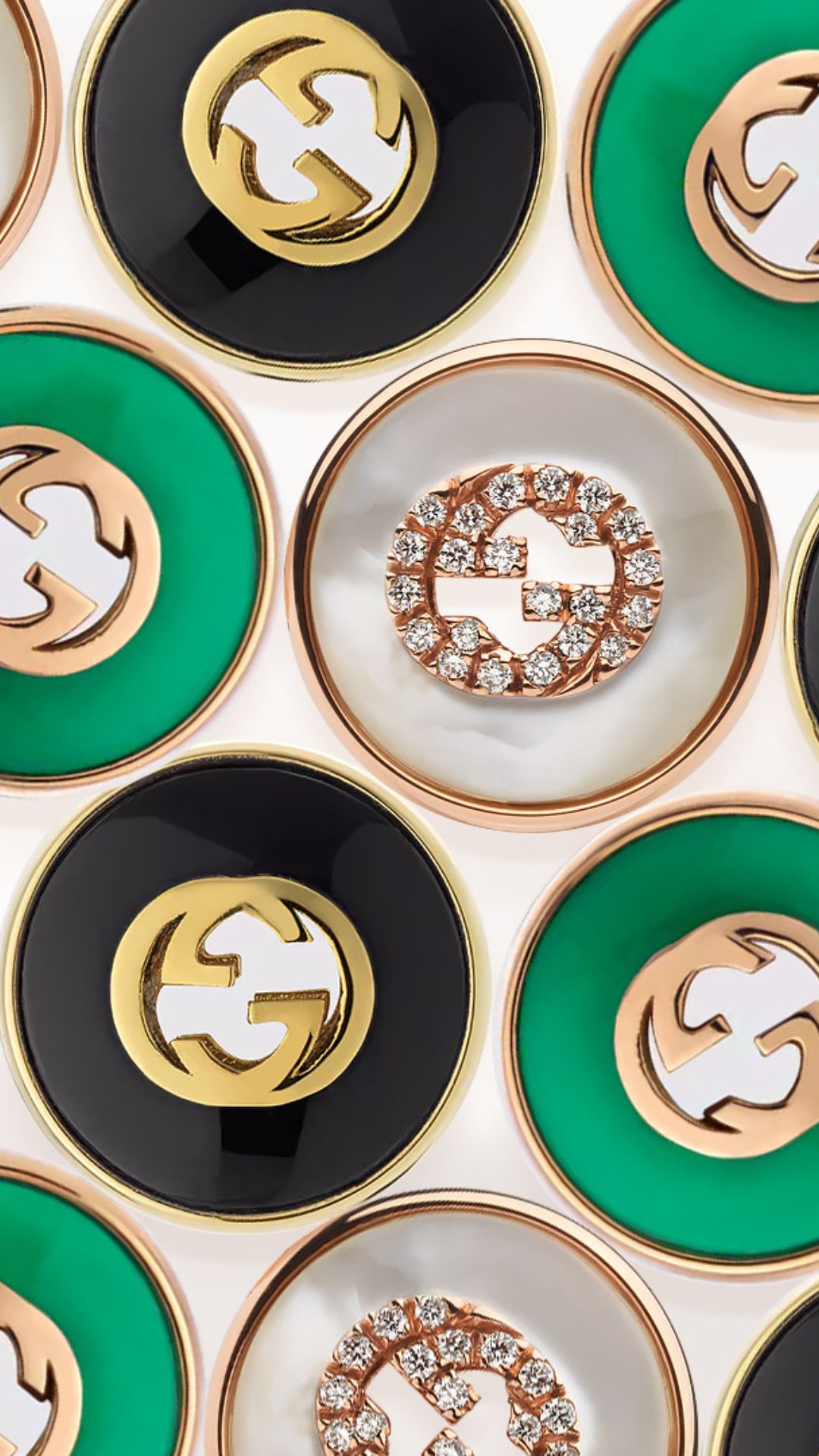 De nieuwste campagne van het modehuis toont nieuwe toevoegingen aan de Gucci Interlocking-sieradencollectie: een moderne interpretatie van het iconische Interlocking G-motief in 18kt rosé- en geelgoud, verrijkt met kleurrijke edelstenen en diamanten.