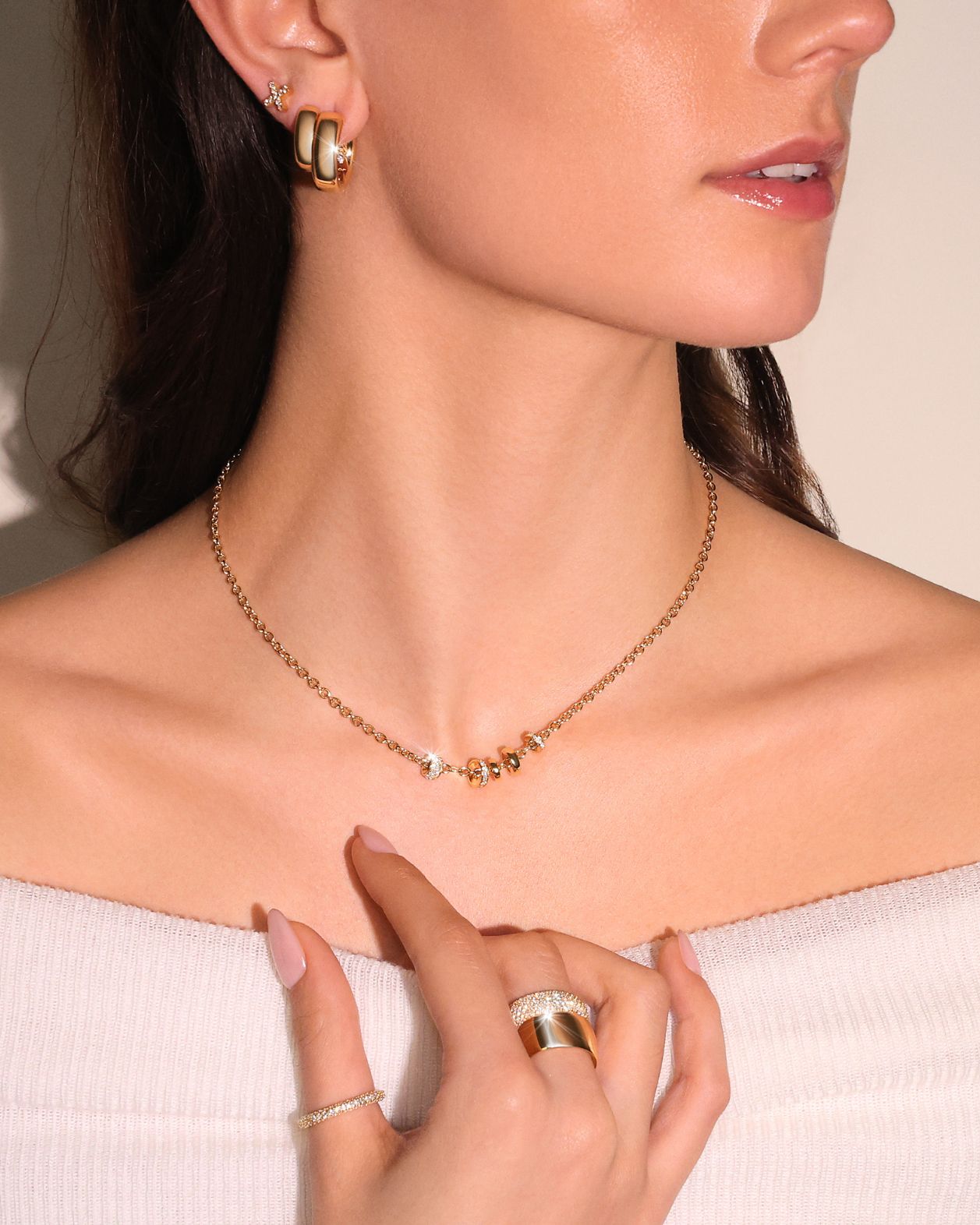 Crafted in 18-karat yellow, white, or pink gold, this necklace features 5 rondelles pendants in plain gold or settled with white diamonds. This necklace combines simplicity with sophisticated layering and is a part of the Kim Maessen MaesterPieces Collection.