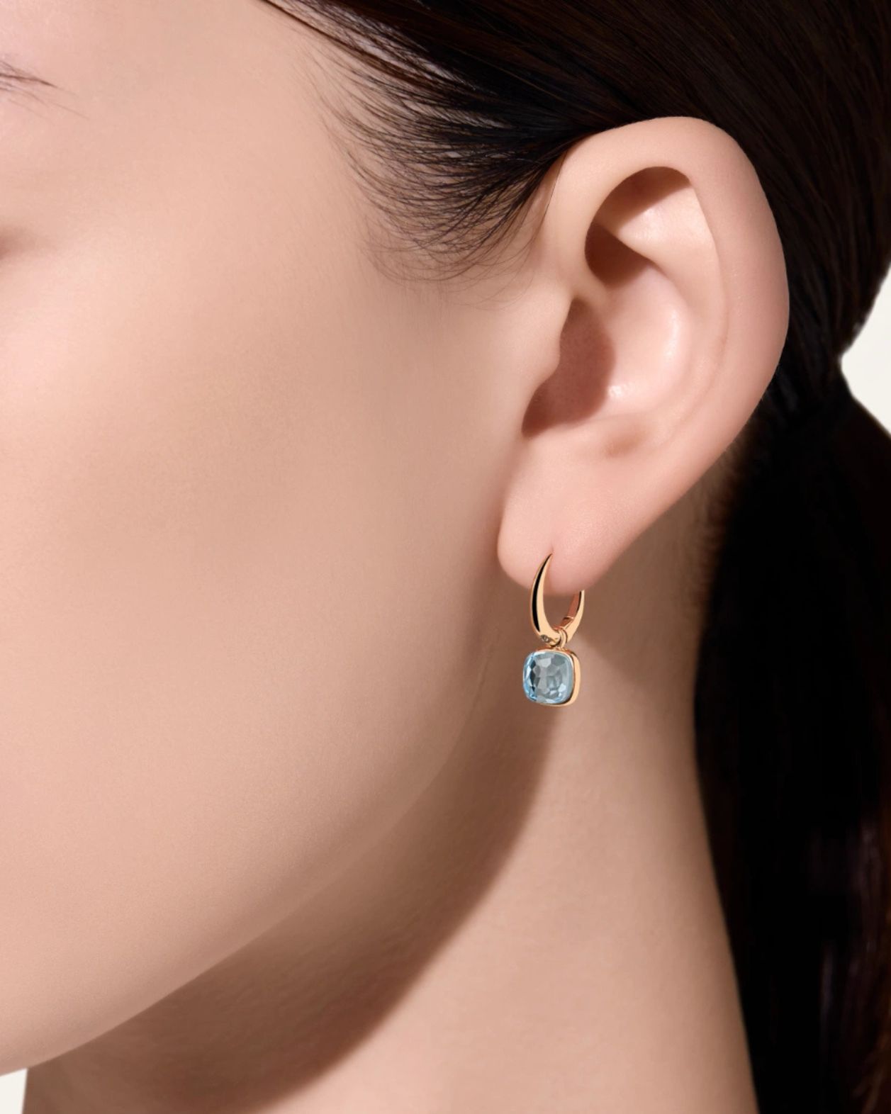 Nudo is quintessentially Pomellato, with its bold design standing as the Maison’s most iconic design. Born from the revolutionary concept of freeing gems from their traditional bezels to showcase their naked splendor, each Nudo jewel captures Pomellato’s unique spirit and Milan’s understated elegance. Every facet tells a story of artistic innovation and masterful craftsmanship. The new Nudo Mini collection presents a refined interpretation, offering the same distinctive character in an intimate scale perfect for everyday wear. These Nudo Mini earrings feature sky blue topaz stones that capture the crystalline waters of the Mediterranean. The more intimate proportions of the Mini collection bring a fresh delicacy to the iconic design, while the clessidra-cut gems showcase Pomellato’s masterful stone-cutting expertise.The sleek hoop design ensures comfortable wear while maintaining the collection’s contemporary elegance.