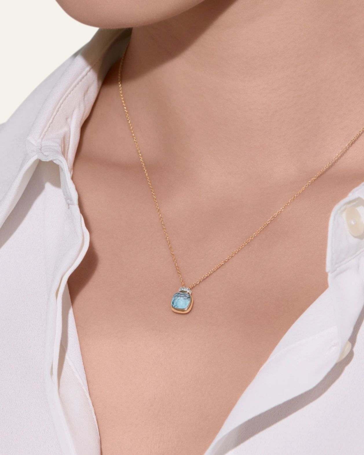 Nudo is quintessentially Pomellato, with its bold design standing as the Maison’s most iconic design. Born from the revolutionary concept of freeing gems from their traditional bezels to showcase their naked splendor, each Nudo jewel captures Pomellato’s unique spirit and Milan’s understated elegance. Every facet tells a story of artistic innovation and masterful craftsmanship. The new Nudo Mini collection presents a refined interpretation, offering the same distinctive character in an intimate scale perfect for everyday wear. This Nudo Mini pendant showcases a clessidra-cut sky blue topaz that evokes the crystalline waters of the Mediterranean. The gem appears to float weightlessly on its rose gold chain, crowned by a delicate row of brilliant-cut white diamonds. The pendant’s smaller scale brings an added versatility to the iconic Nudo design, while maintaining its sophisticated presence. The ethereal blue tone creates a luminous effect that embodies Pomellato’s contemporary approach to luxury.