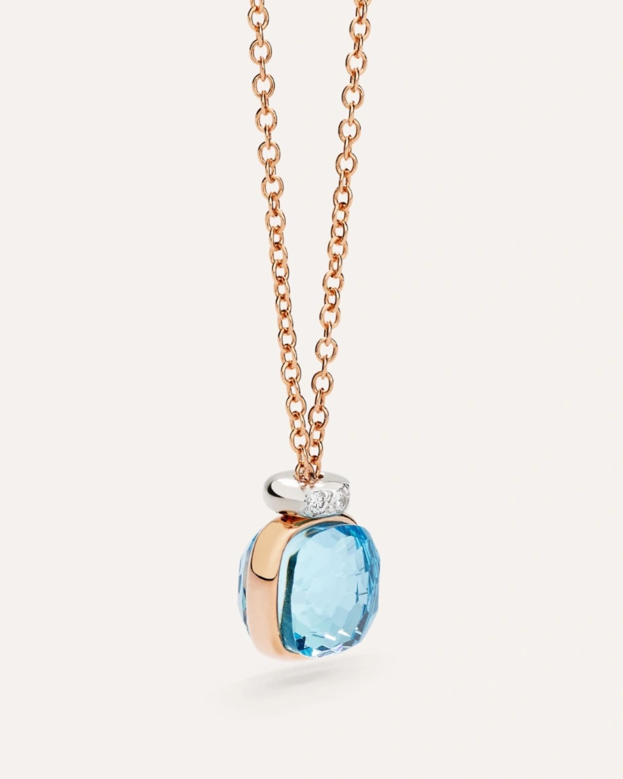 necklace with pendant in 18k rose and white gold with 1 sky blue topaz (≈3.6 cts) and 3 white diamonds ( ≈ 0.02 ct) on 18k rhodium-plated white gold.