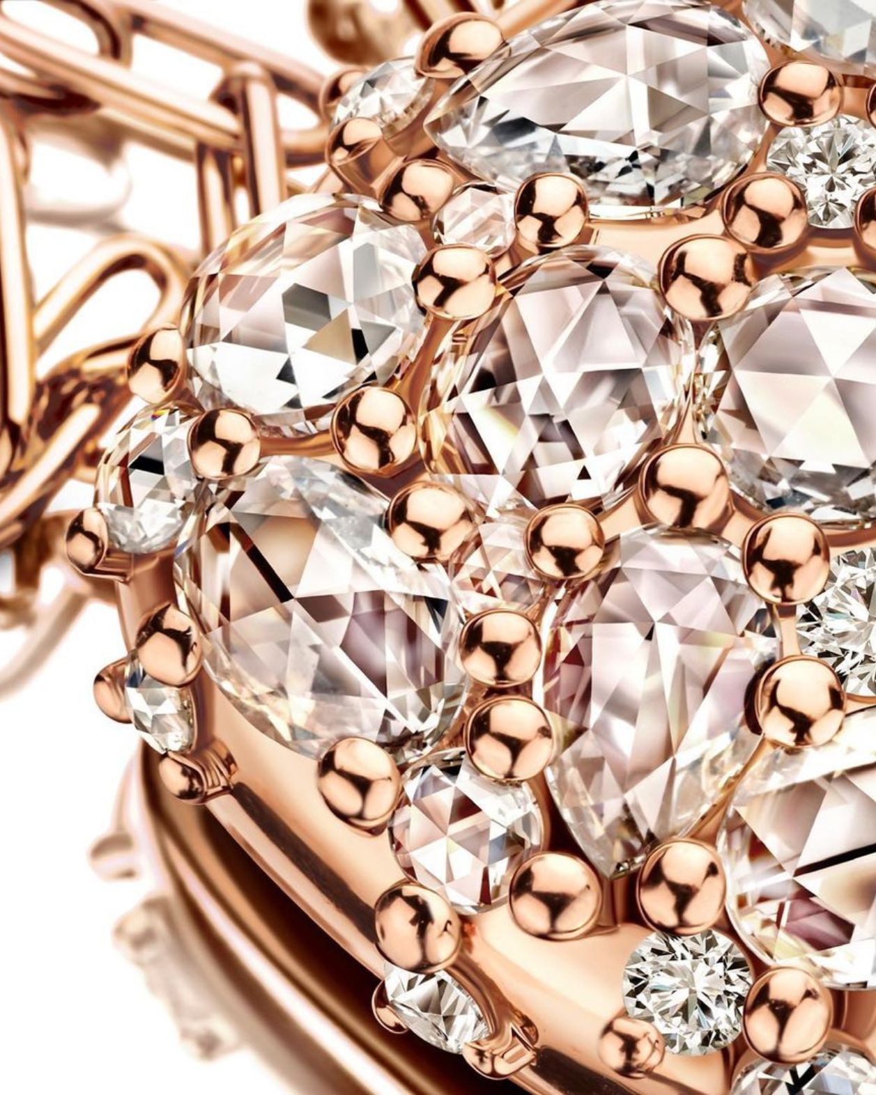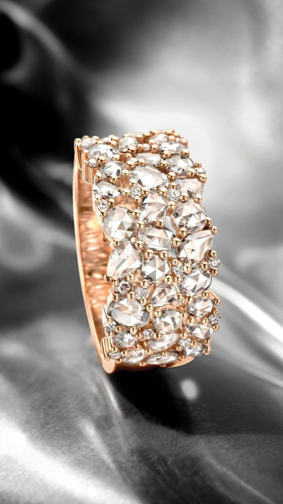 Roosgeslepen diamanten produceren een ander soort glans. Roos 1835, waar het gebruik van roosgeslepen diamanten centraal staat. De rose cut is een historische, een bijna vergeten slijpvorm. Roosgeslepen diamanten hebben in tegenstelling tot briljantgeslepen diamanten een vlakke achterzijde. Elke diamant heeft na slijping een geheel eigen vorm, die voor de ontwerpers van Roos 1835 leidend is voor het uiteindelijke ontwerp.